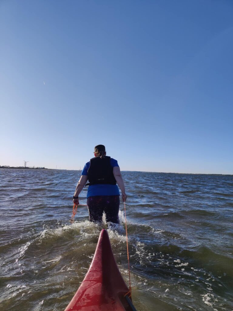 Blæsten går ofte frisk over Limfjordens vande, og det gjorde den også den dag. Og vi havde modvind. Det er svært at padle en let kano op i mod vinden, især når vandet ikke er dybt nok til at man rigtig kan få padlen i. Vi knoklede alt hvad vi kunne, og nu var det for alvor med sammenbidte tænder. Men vi rykkede os ikke meget, og den mindste lille pause eller uregelmæssighed i padlingen bragte os ud af kurs eller skubbede os de meter tilbage vi trods alt havde kæmpet os frem. Det var urimelig hårdt, og det var slet ikke sjovt. Til sidst var der ikke andet at gøre end at stå af og trække, så det gjorde jeg. Igen.