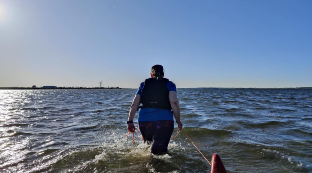 Det var sådan set ikke fordi det var tungt at trække kanoen med Karen i. Men at gå i vand til knæene, på blød sandbund, i modvind, det er faktisk hårdt. Selvom vi nu klart bevægede os fremad, så var der langt til målet. Karen ymtede noget med at vi kunne skiftes til at trække. Men dels havde hun jo ikke skiftesko med, og dels kunne jeg mærke at jeg nu var blevet stædig og VILLE gennemføre dette. Så jeg bed tænderne sammen og bad hende synge en sang eller fortælle en historie, så jeg kunne tænke på noget andet mens jeg maste afsted. Men det mente Karen ikke lå indenfor hendes kompetenceprofil, som ellers er overordentlig rummelig – som alle læsere på bloggen her ved, er hun den perfekte turkammerat, og i øvrigt er hun en enormt kompetent og værdsat kollega. Men at synge og fortælle historier var ikke en mulighed.