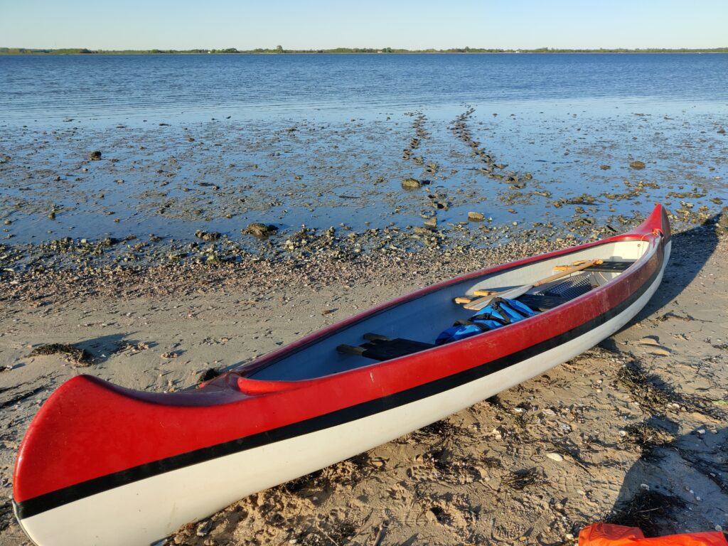 Jeg ved ikke hvor lang tid det tog, men omsider var vi på højde med shelterpladsen, og jeg kunne sætte kursen mod stranden. Så kom det tidspunkt, hvad kanoen igen skrabede bunden. Der var ingen vej uden om, at Karen også måtte ud af kanoen, for jeg kunne ikke trække den ind alene. I første omgang mente jeg dog, at jeg kunne vinde 50-100 meter mere, hvis Karen flyttede sig fra det forreste sæde til midten af kanoen.
