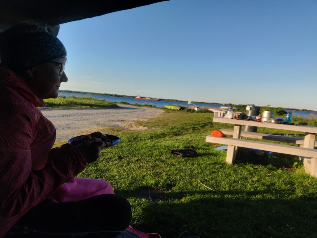 Nu og her var der dog ikke andet at gøre, end at få hende til at hjælpe med at trække kanoen ind til land, våd fra top til tå som hun var. Så snart vi var på land tog hun sine ting, og løb det sidste stykke op til shelteren, for at skifte til tørt tøj. Jeg kom lidt til hægterne og pakkede kanoen sammen, før jeg fik tørt tøj på og sluttede mig til Karen, som sad og skælvede af kulde i shelteren. Ingen af os havde ret meget tøj med, det var jo en lun dag, så der var ikke andet at gøre end at låne Karen mine tørre sko, og sætte hende til at løbe op og ned af vejen, indtil hun var så varm at også hænder og fingre føltes varme. I mens lavede jeg aftensmad til os, og ringede efter ham, der skulle hente os og kanoen.